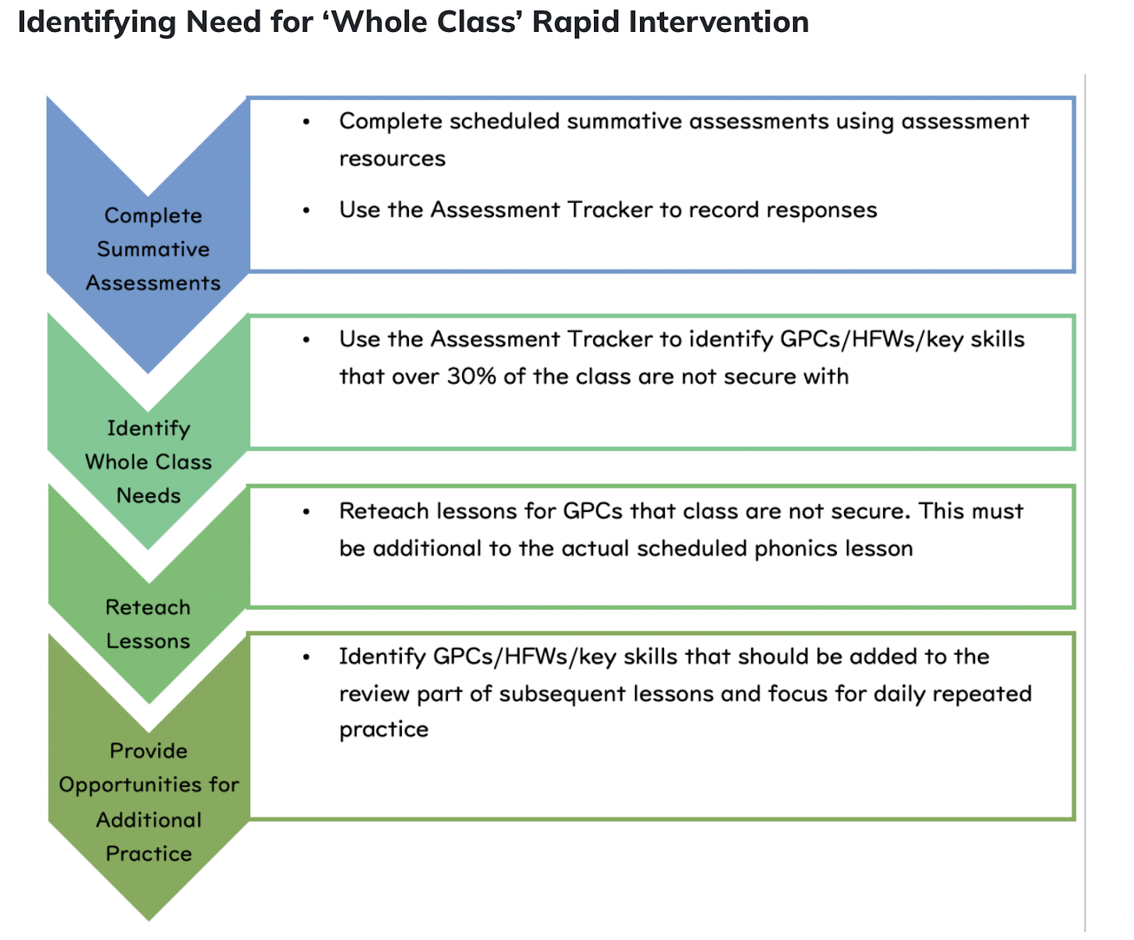 Under the Assessment tab. Using the Online Assessment Tracker, teachers will be able to highlight those children who require ‘Rapid Intervention’. They will be able to clearly identify gaps in children’s learning whether that be GPCs, blending/segmenting skills or HFWs. It is important, however, to note that providing interventions should not solely rest with the outcomes of scheduled summative assessments. Any children at risk of not keeping up should be identified immediately from classroom observations and Same Day interventions and then Rapid Intervention started immediately. If children have more than one area of concern, teachers will need to deliver separate interventions for these needs.