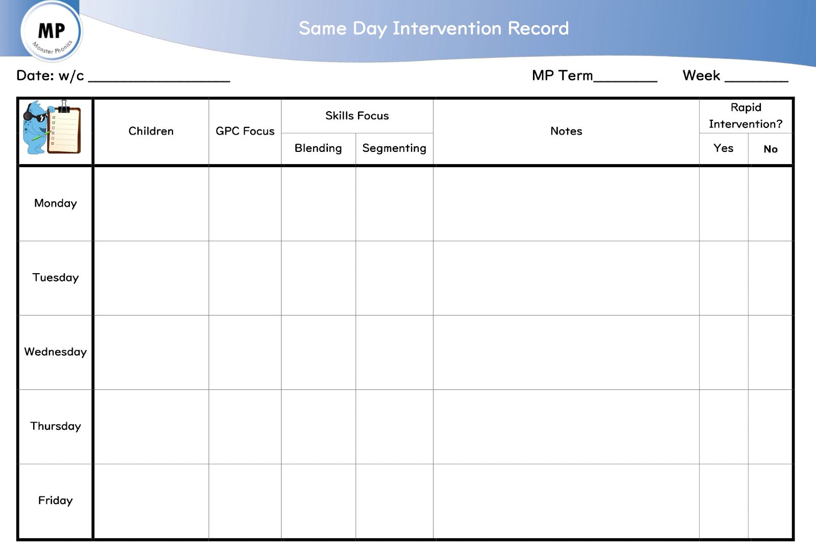 All guidance, planning and record sheets for each type of intervention can be found on the Monster Phonics website.