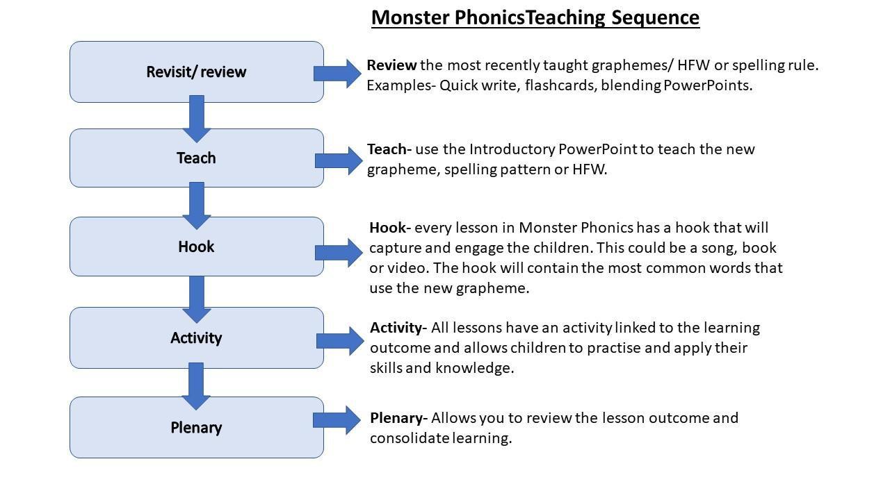 A Monster Phonics lesson should be daily 20-30 minute lessons for Reception, Year 1 and Year 2 children. Lessons are taught whole class and follow a keep up not catch-up approach. All children should be given support within the lesson and lessons should be well resourced using flashcards, sound mats, magnetic letters and phoneme frames.