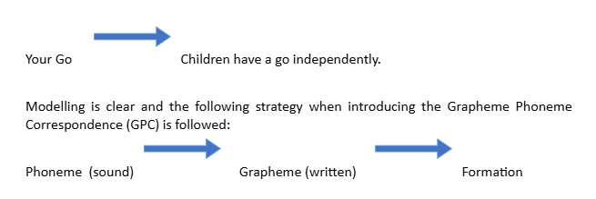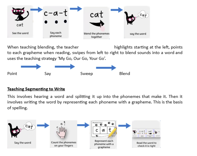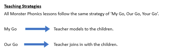 teaching strategies to support learners e.g. ‘my go, our go, your go’ and ‘phoneme fingers’.