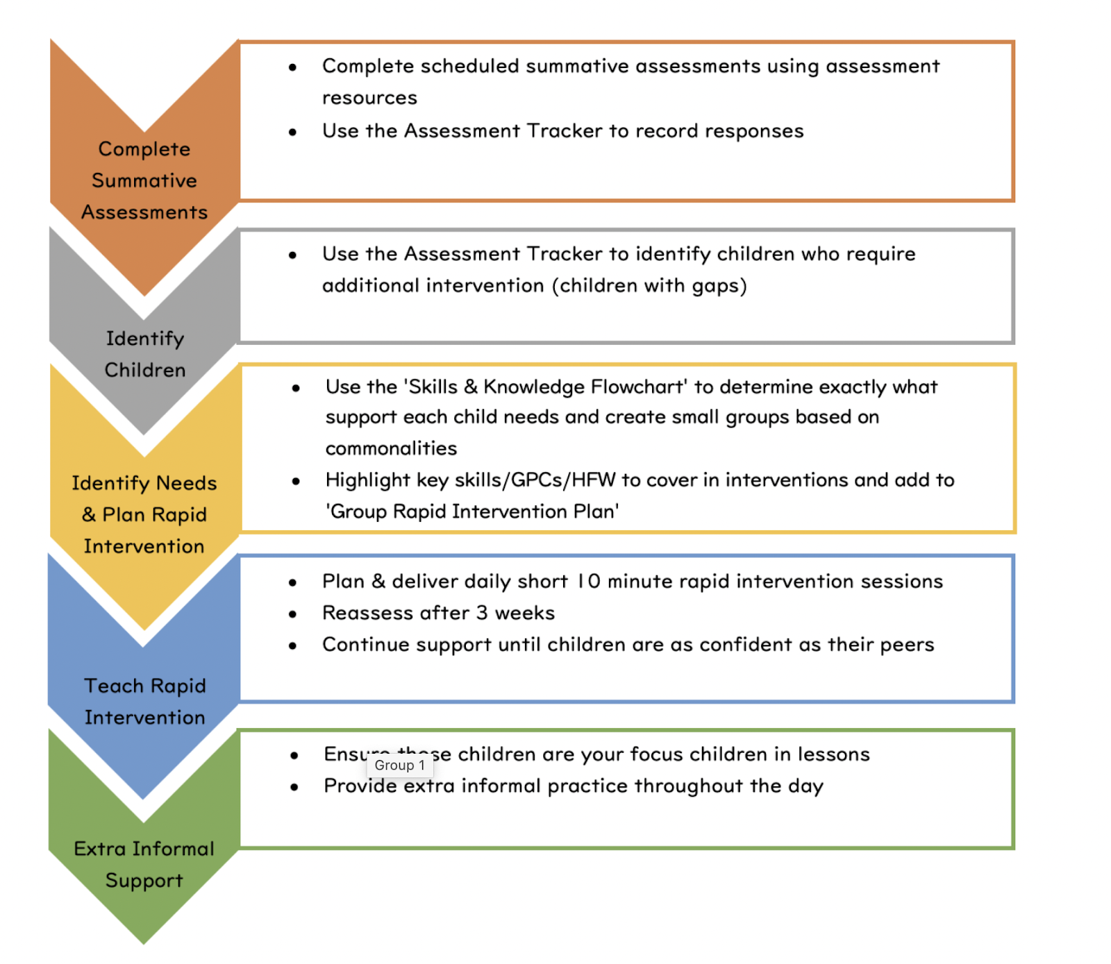 Individual Rapid Intervention sessions should be daily 5 to 10 minute sessions and be delivered by trained members of staff. Interventions should run for 6 weeks, with children being reassessed after 3 weeks. Teachers do not need to complete all 6 weeks if a child is confident and maintaining pace with their peers.
