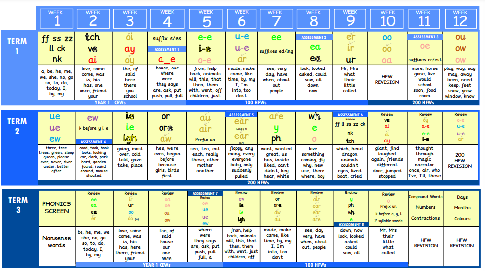 The year group progression documents seen above show when the scheduled assessments are to happen. All assessment resources can be found on the Monster Phonics website
