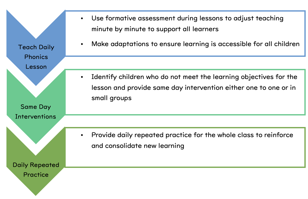 These children should then have a ‘Same Day Intervention’ session. Where possible, the intervention session should be delivered on the same day as this will allow gaps in phonics knowledge to be addressed before the next phonics session. It is also important that these sessions are routinely timetabled and happen.