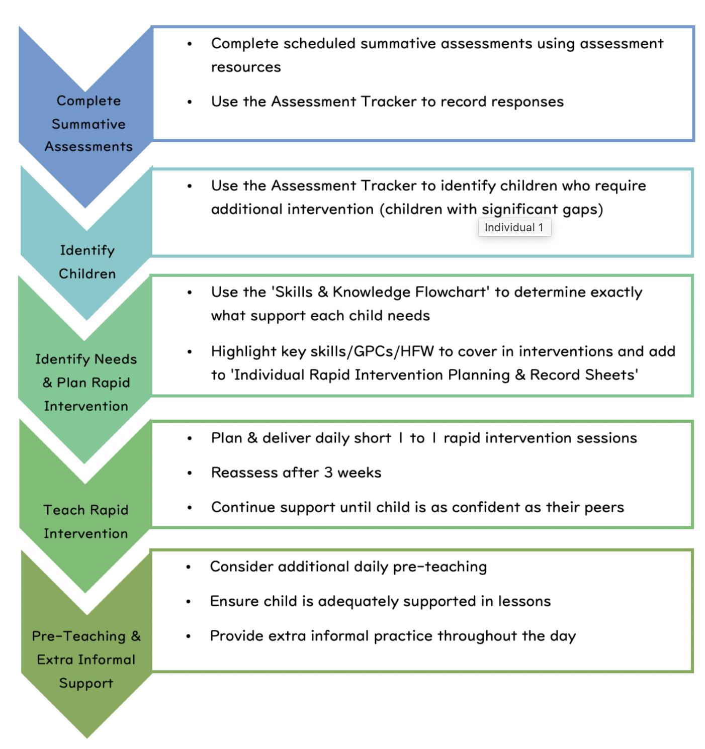 Individual interventions can be used for children to fill in their individual knowledge gaps of the GPCs and HFWs, they have previously been taught but not secured, and for developing the key skill of blending.